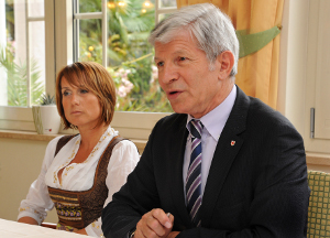 LR Berger bei der Vorstellung der neuen Tourismusfinanzierung. Neben ihm die Gastgeberin im Vilpianerhof, Elisabeth Visintainer, die gleichzeitig Präsidentin des Tourismusvereins Terlan ist.