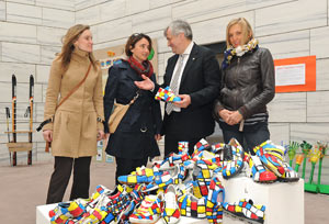 LR Mussner mit Projektleiterin Margit Perathoner und den Lehrerinnen Micole Speziani und Nadia Moroder (v.r.) bei der Besichtigung der Ausstellung "Trash Art".