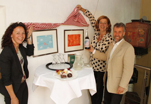 Feierliche Übergabe der Karikaturen von Anton Frühauf an das Touriseum (v.li.): Mariana Frühauf, LRin Kasslatter Mur, Museumsdirektor Paul Rösch.