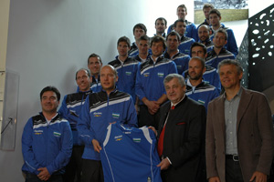 Vorgestellt: die ladinische Mannschaft bei der Europameisterschaft der Minderheiten, vorne v. re: Istitut-Ladin-Präsident Videsott, LR Mussner, Koordinator Costabiei.