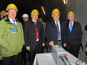 LH Durnwalder mit LH-Stv. Berger, LR Mussner und Bgm. Franz Locher beim Tunnelanstich für den Tunnel "G2".