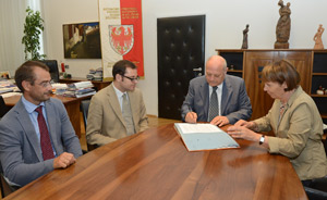 LH Durnwalder unterzeichnet mit Agentur-Präsident Thomas Mathà die Vereinbarung. Links Agentur-Direktor Alfred Aberer, rechts Vizepräsidentin Maria Larcher.