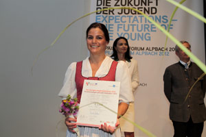 Karen Putzer wurde im Beisein von Wissenschaftsminister Karlheinz Töchterle und den drei Landeshauptleuten für ihre Arbeit zum Thema "Die strafrechtliche Haftung von Skifahrern bei Lawinen" mit dem mit 2.000 Euro Preis ausgezeichnet.