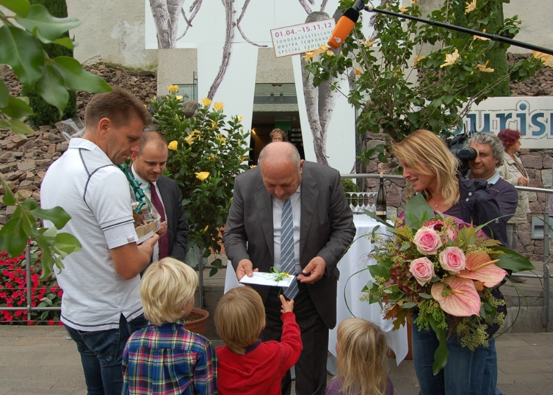 Um den viermillionsten Gartengast zu ehren, war auch der Landeshauptmann und Präsident der Gärten, Luis Durnwalder, nach Trauttmansdorff gekommen. Er überreichte Tanja Ripperger einen Gartenführer, einen Geschenkekorb mit Laimburg-Produkten und zehn Eintrittskarten für die Gärten.