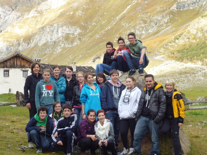 Die Zweite Klasse der Berufsfachschule Handel und Verwaltung der LBS-Luis Zuegg vor dem AVS Bergheim in Pfelders mit den beiden Lehrerinnen Annelies Mayr (links) und Miriam Leitgeb (rechts).