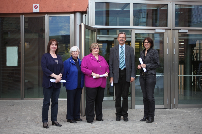 Südtiroler Modell begutachtet (v.li.): Die Schweizer Kosmetikfachlehrerinnen Monika von Allmen (mit Begleitung), Silvia Vifian und Rektor Heinrich Klaus mit der geschäftsführenden Direktorin Edit Meraner vor der Landesberufsschule.