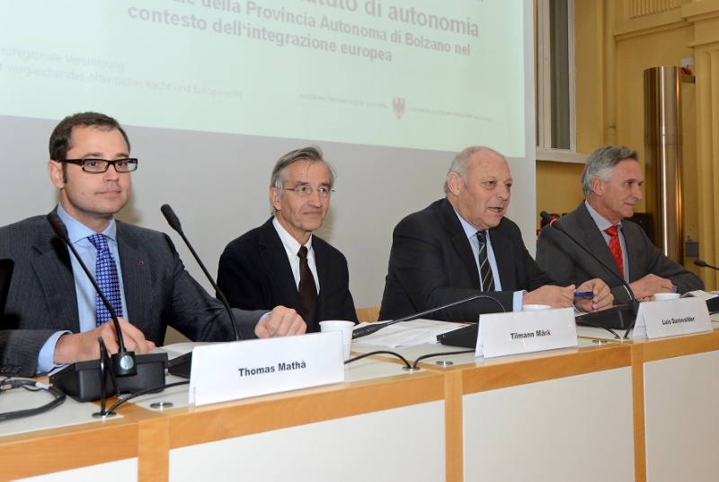 Die Auswirkungen der europäischen Integration auf die autonomen Kompetenzen Südtirols analysierte anschließend Walter Obwexer von der Universität Innsbruck ein. Abteilungsdirektor Thomas Mathà referierte über die autonome Vollziehung von EU-Recht anhand ausgewählter Kompetenzen Südtirols und wählte dabei die biologische Landwirtschaft und die Bestimmungen zu Seilbahnanlagen und Luftfahrthindernissen als Beispiele. Wie das Land Südtirol am europäischen Integrationsprozess mitwirken kann, darauf ging Jens Woelk, Universität Trient ein.