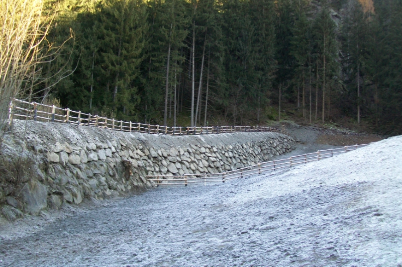 So hat die Abteilung Wasserschutzbauten nun den Damm erneuert und dabei verlängert und erhöht. Der neue Damm wurde nach dem Geländeverlauf ausgerichtet, wobei an Ort und Stelle befindliche Baumaterialien genutzt wurden, zum Teil stammten diese von alten Murabgängen, zum Teil aus dem Bachbett.
