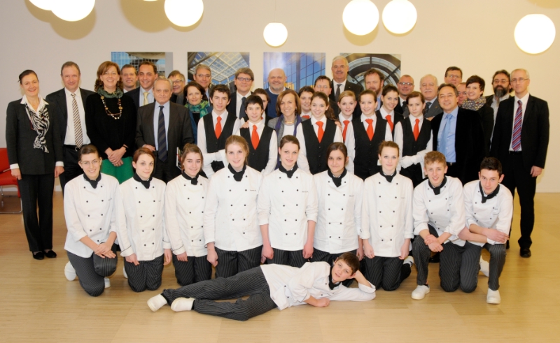 Ministerin mit Küchenbrigade: An der Landesberufsschule "Gutenberg" stand nicht nur ein Treffen mit Berufsbildung und Sozialpartnern auf dem Programm, sondern auch ein von Schülern und Fachlehrern zubereitetes Mittagessen