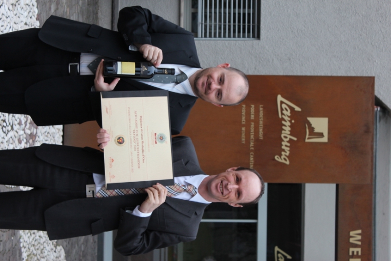 Daniel Bedin, Direktor der Gutsverwaltung Laimburg mit einer Flasche des prämierten Gewürztraminers Elyònd sowie Urban Piccolruaz, Kellermeister des Landesweinguts mit dem Diplom der Großen Goldmedaille
