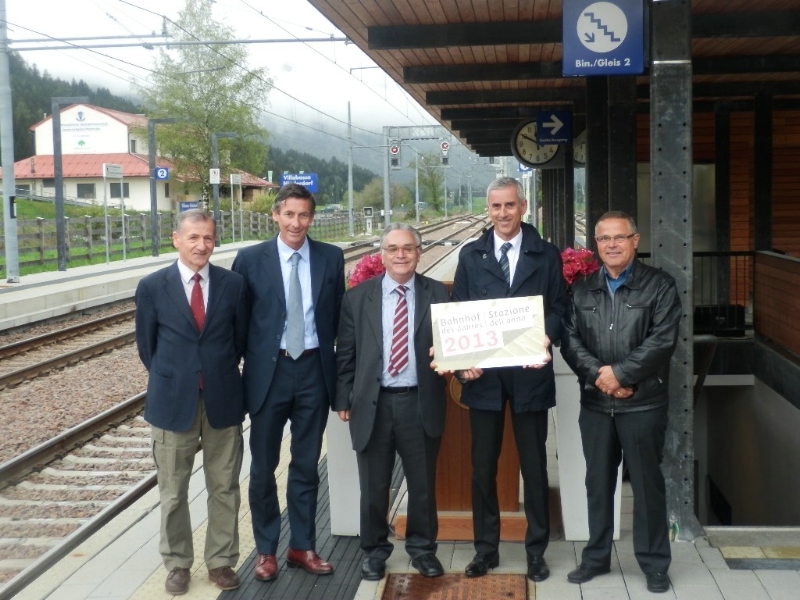 Walter Weiss, Präsident des Vereins Freunde der Eisenbahn, freute sich über die zunehmende Bedeutung, die der Eisenbahn landesweit, seitens der Gemeinden und seitens der Bürger, beigemessen wird: Immerhin 70 Bürgermeister seien mittlerweile im Verein „Freunde der Eisenbahn" engagiert, sagte Weiss. Als Präsident des Vereins überreichte Weiss zusammen mit Landesrat Widmann und Jurypräsident Scheidle die Auszeichnung an Bürgermeister Ploner und Altbürgermeister Passler. Die Musikkapelle Niederdorf sorgte für die musikalische Umrahmung der Feier.