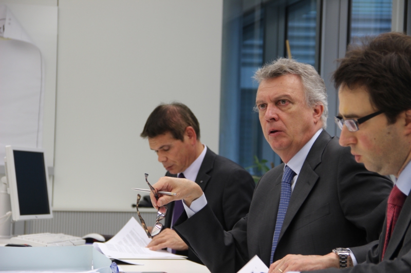Arbeitspakt: LR Bizzo zwischen Ressortdirektor Andrea Zeppa und Abteilungsdirektor Helmuth Sinn während der Sitzung der Landesarbeitskommission. Foto: DiKOM/mb.