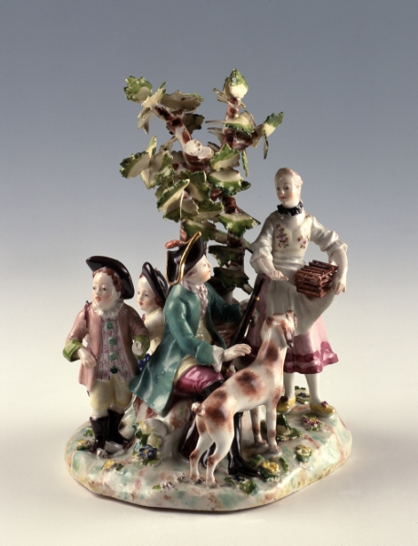 Die bunt bemalte Porzellangruppe zeigt einen Jäger mit Jagdhund, eine Dame mit Vogelkäfig und zwei in Jagdkleidung adjustierte Kinder. Es handelt sich um ein Stück des umfangreichen, noch erhaltenen Porzellanservices, das Fürstbischof Leopold von Spaur im Jahre 1765 bei der Wiener Porzellanmanufaktur anlässlich des Besuches der Kaiserin Maria Theresia angekauft hat.