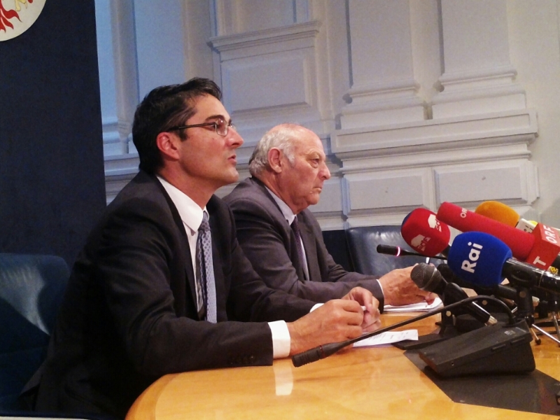 Gemeindepräsident Kompatscher und Landeshauptmann Durnwalder bei der gemeinsamen Pressekonferenz. Foto: DiKOM/ohn.