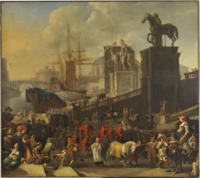 Das Gemälde stammt von dem 1622 in Frankfurt am Main geborenen und 1674 in Amsterdam verstorbenen Johannes Lingelbach und könnte ein Hinweis auf dessen Eintreffen in Rom im Jahre 1644 sein. Am 23. November dieses Jahres fand dort die Prozession des neugewählten Papstes Innozenz X. statt. Der gerade in Rom angekommene Lingelbach könnte dieses besondere Ereignis miterlebt und viel später (um 1655-1660) in diesem Gemälde festgehalten haben.
