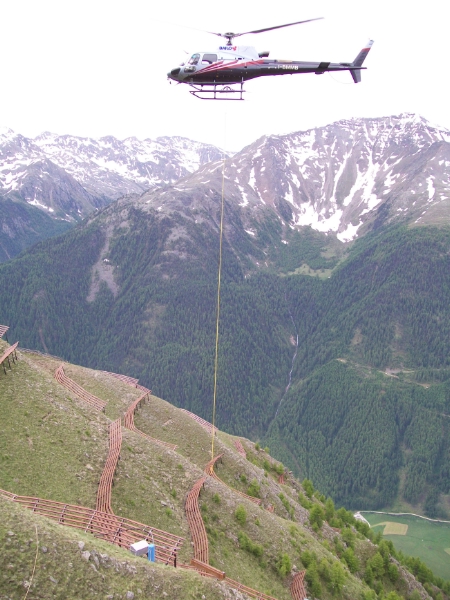 174 Laufmeter Schneebrücken aus Stahl werden in sehr steilen Gelände mit Hilfe eines Hubschraubers montiert