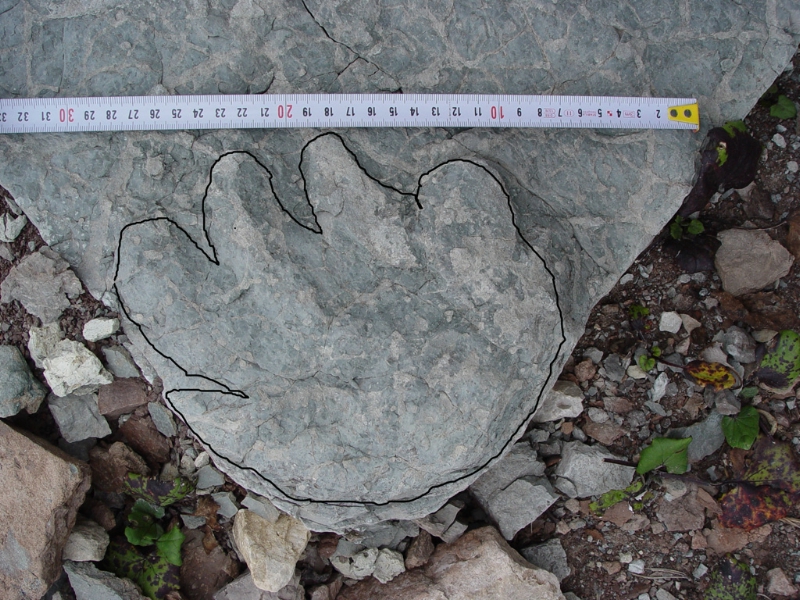 Diese Spuren, die im Grödner Sandstein relativ häufig vorkommen, werden „Pachypes dolomiticus" genannt und Pareiasauriern zugeschrieben, die im Oberperm vor mehr als 250 Millionen Jahren weltweit verbreitet waren. Sie waren sozusagen die „Kühe" der Permzeit: plumpe Pflanzenfresser aber mit knöchernen Panzerplatten und Stacheln bewehrt. Sie wurden bis zu drei Meter lang und erreichten ein Gewicht von 600 Kilogramm.