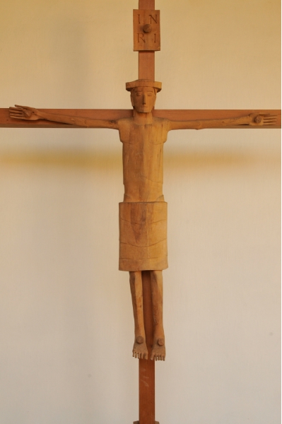 Das von Martin Rainer um 1965 oder wenig später geschnitzte Kruzifix ist 120 Zentimeter hoch und ebenso breit. Es zeigt den Gekreuzigten sowohl in seinem Körper als auch in der Gestaltung des Lendenschurzes in sehr strenger formaler Reduktion. Rainer greift formal wie inhaltlich auf eine sehr frühe Tradition der Kreuz-Darstellungen zurück, in der nicht das Leid und der Tod Jesu in den Vordergrund gestellt werden, sondern mehr der Lobpreis seiner Auferstehung und die Erwartung seiner Wiederkunft. Genauer betrachtet ist er trotz Nägel in den Händen und Füßen gar kein gekreuzigter Christus, der am Kreuze angenagelt hängt, sondern ein stehender, bzw. schwebender und lebendiger Christus, der dem Betrachter mit ausgebreiteten Armen begegnet.
