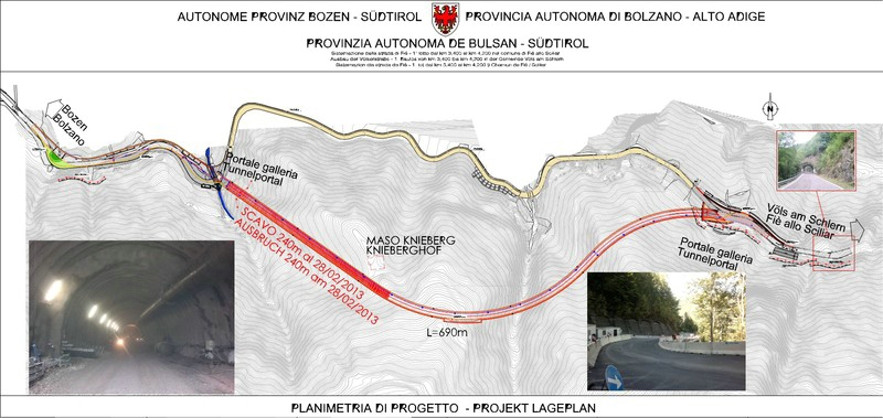 Über die Bauarbeiten, die in den Händen der Bauunternehmen Oberosler Cav. Pietro, Keller Fondazioni und Bitumisarco liegt, berichtete heute der Direktor der Landesabteilung Tiefbau, Valentino Pagani und die Projektverantwortliche Ingenieurin Gabriella Zanetti. Demnach gilt es nun noch die Innenschale des Tunnels auszuführen, die technischen Anlagen einzubauen und verschiedene Arbeiten im Freien durchzuführen sowie den bestehenden Felstunnels abzubrechen. Im Juni 2014 soll der insgesamt zwölf Millionen Euro teure Tunnel dann fertiggestellt sein.