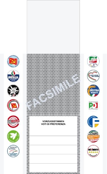 Zwar gibt es ein neues Gesetz, das die Wahl des Südtiroler Landtags regelt, in Sachen Stimmen und Stimmzettel hat dieses allerdings keine Änderungen mit sich gebracht. Jeder Wähler bekommt demnach am Sonntag kommender Woche einen Stimmzettel ausgehändigt, auf dem er die Symbole der 14 wahlwerbenden Listen finden wird. Auf der linken Seite sind untereinander die Symbole der Südtiroler Kommunisten, von Unitalia, SVP, Rifondazione Comunista, Süd-Tiroler Freiheit, der Grünen und von Scelta Civica per l'Alto Adige angeordnet, während sich auf der rechten Seite die Listenzeichen von Forza Alto Adige - Lega Nord - Team Autonomie, L'Alto Adige nel cuore, La Destra Minniti, PD, Freiheitlichen, Ladins Dolomites - Bürgerunion - Wir Südtiroler sowie des Movimento 5 Stelle finden. Jeder Wähler verfügt über eine Listenstimme, die er dadurch vergibt, dass er das jeweilige Symbol einer Liste klar und deutlich ankreuzt.