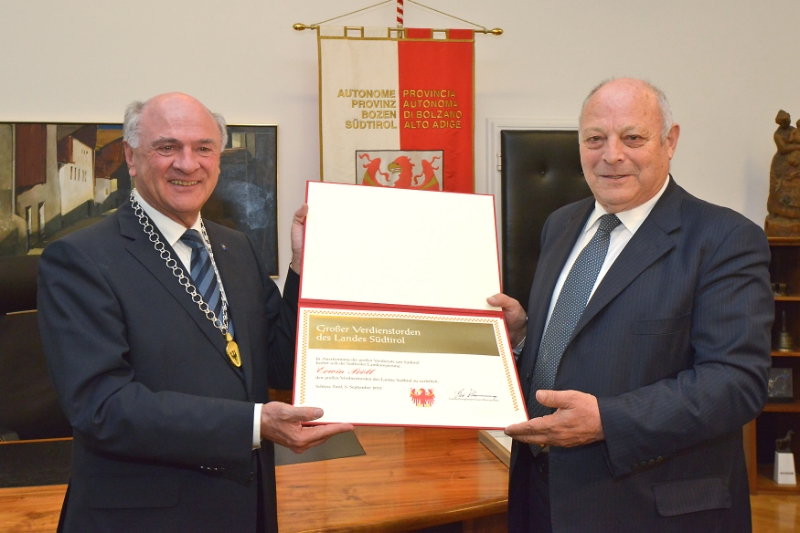 Der Große Verdienstorden sei Zeichen der Dankbarkeit Südtirols und Ausdruck dafür, dass "Land und Leute nie vergessen, wer für die Entwicklung Südtirols verantwortlich ist: zum einen die Südtiroler selbst, zum anderen eine Vielzahl an Freunden, die das Land von außen unterstützt haben", so Durnwalder bei der heutigen Verdienstordens-Verleihung an seinen Amtskollegen, der bei der feierlichen Verleihung Anfang September auf Schloss Tirol verhindert gewesen war.