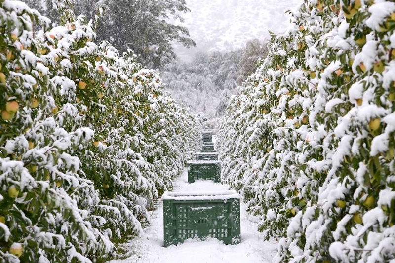 Apfelernte im Schnee: Einen Wintereinbruch gab es am 10./11. Oktober, im Bild Tschengels (Foto: Landeswetterdienst/Florian Peer)
