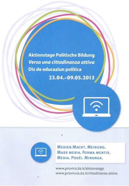 Die Ehrung Franz Thalers als politische Persönlichkeit des Jahres, das Projekt "Stolpersteine" in Meran, das an die Deportation der Juden aus der Passerstadt erinnert, der Workshop an der Mittelschule der Ursulinen in Bruneck zum Thema "Kinderrechte" sind nur drei von vielen Aktionen der Aktionstage Politische Bildung 2013. Die Aktionstage finden alljährlich vom 23. April bis zum 9. Mai statt. 2013 standen sie unter dem Thema "Medien.Macht.Meinung". In den nun erschienenen Jahresheften, eine Dokumentation in Heft-Format, werden die bedeutendsten Initiativen noch einmal in Erinnerung gerufen.