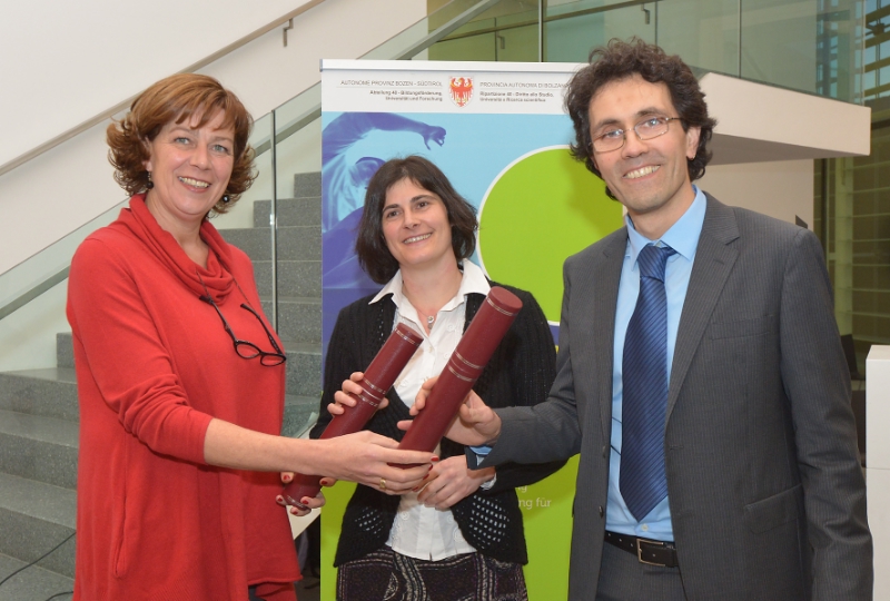 "In diesem ersten Jahr der Verleihung der Forschungs- und Wissenschaftspreise haben sich insgesamt 24 Kandidaten darum beworben, die in ganz unterschiedlichen Fachgebieten tätig sind", zog bei der heutigen Verleihung Landesrätin Sabina Kasslatter Mur Bilanz. Mit der Bewertung der diversen Anträge wurde eine international besetzte Fachjury beauftragt, in der sieben Experten lokaler und externer Forschungseinrichtungen zusammen gearbeitet haben, nämlich Heidi M. Siller (Fachbereich Romanistik) und Margaretha Friedrich (Fachbereich Geschichtswissenschaften) von der Universität Innsbruck, Max Haller (Fachbereich Soziologie) von der Uni Graz, Michele Larcher (Umweltingenieurwesen) von der Universität Trient sowie Gabriella Dodero (Fachbereiche Mathematik, Informatik) von der Uni Bozen, Peter P. Pramstaller (Fachbereich Biomedizin) von der Eurac und Michael Oberhuber (Fachbereich Chemie) von der Laimburg. Auf ihren Vorschlag hat die Südtiroler Landesregierung anfangs Dezember 2013 den Südtiroler Forschungspreis der 36-jährigen Biologin Barbara Beikircher aus Bruneck zugesprochen, die am Institut für Botanik der Universität Innsbruck forscht und lehrt, wo sie zuvor auch ihr Biologiestudium (Studienzweig Botanik mit Wahlfach Mikrobiologie) abgeschlossen hat. Mit dem Preis will sie in erster Linie ihr Projektvorhaben "Verminderte Trockenheitsresistenz bei Apfelbäumen: Verursacht durch Fehlbildungen im Holz?" umsetzen. Der Südtiroler Wissenschaftspreis für das Jahr 2013 wurde hingegen Diego Calvanese zugesprochen. Der aus einer zweisprachigen Familie stammende und in Innsbruck geborene 47-jährige Informatiker hat sein Studium inklusive Forschungsdoktorat an der römischen Universität "La Sapienza" absolviert und lehrt an der Fakultät für Informatik der Freien Universität Bozen.