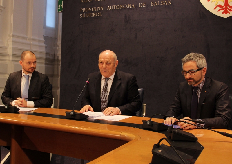 Letzte Pressekonferenz als Landeshauptmann: Luis Durnwalder zwischen Garten-Direktor Daniel Bedin und Laimburg-Chef Michael Oberhuber. Foto: DiKOM/mb.