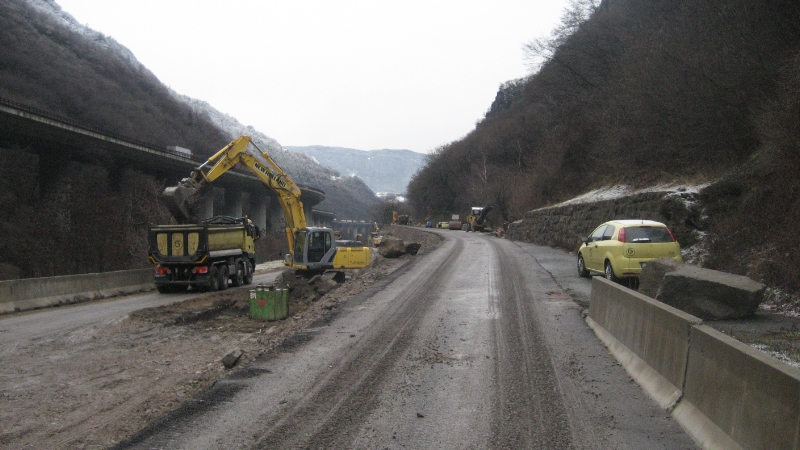 Sämtliche Arbeiten in der Nähe der Abbruchstelle werden von der Landesabteilung Tiefbau koordiniert. Nach den ersten dringenden Eingriffen der Landesabteilung Straßendienst in Absprache mit dem Landesamt für Geologie und Baustoffprüfung, hat das Unternehmen „Gregorbau" aus Blumau bereits am vergangenen Wochenende die Arbeiten für den Bau des neuen Straßenabschnitts aufgenommen. Die Zuweisung der Arbeiten erfolgte in Rekordzeit, und zwar bereits am 24. Jänner, aufgrund eines informalen Wettbewerbs zu dem vier Unternehmen aus der Gegend eingeladen wurden. Für die Arbeiten gilt nämlich die höchste Dringlichkeitsstufe.