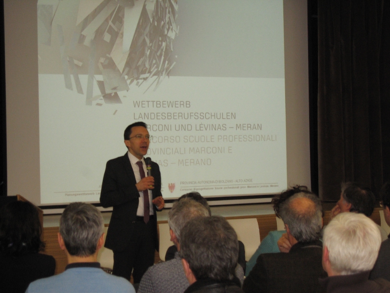 LPA - In Meran sollen die beiden italienischen Landesberufsschulen, jene für Handwerk, Industrie und Handel und für soziale Berufe, ein gemeinsames Dach erhalten. Zu diesem Zweck hatte das Land einen Planungswettbewerb durchgeführt, aus dem der Projektvorschlag von Architekt Marco Robecchi für die Umsetzung ausgewählt wurde. Eine Ausstellung der Wettbewerbsarbeiten wurde heute (28. Februar) durch Landesrat Christian Tommasini im Realgymnasium in Meran eröffnet.