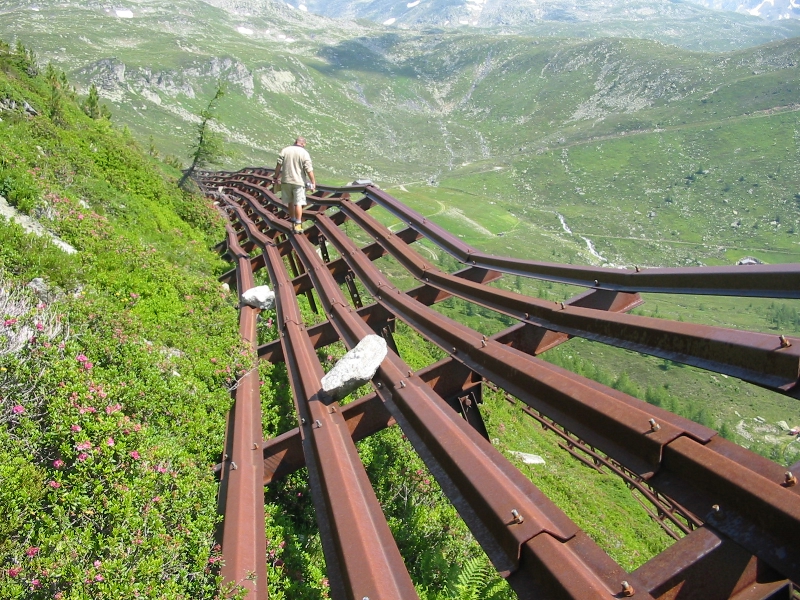 Vorarbeiter Hubert Brugger und seine Arbeiter überprüfen auf der Grubbachalm die Verankerungen der Schneebrücken und Schneeverwehungszäune. Falls notwendig, werden diese saniert und veraltete Teile ersetzt. Bis Anfang Oktober sollten die Arbeiten abgeschlossen sein. Für Planung und Bauleitung zeichnet Amtsdirektor Sandro Gius verantwortlich: "Der vergangene schneereiche Winter", erklärt er, "hat an den Lawinenverbauungen etliche Schäden angerichtet. Die Bauwerke sollen so bald als möglich wieder funktionstüchtig sein, um Lawinenabgänge zu verhindern".