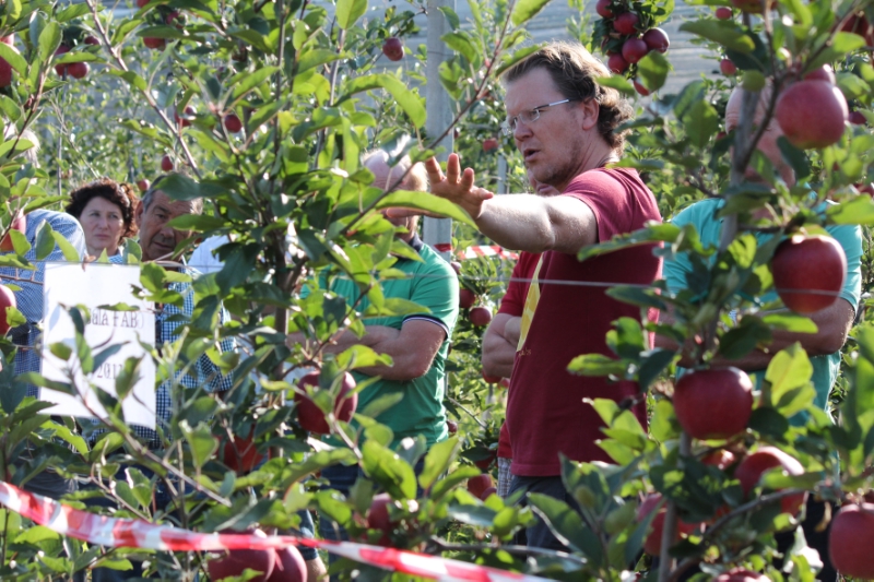 300 Besucher aus drei Kontinenten: Pomologe Walter Guerra hat in den Versuchsanlagen der Laimburg die Prüfergebnisse von Gala-Mutanten vorgestellt (Foto: Laimburg/Oswald Bauer)