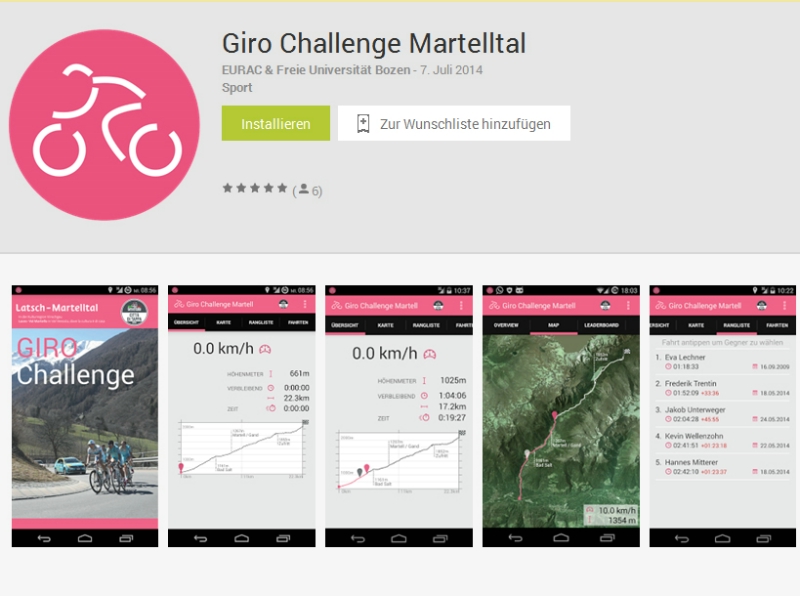 Die im Rahmen von "O-Star" entwickelte "Giro Challenge"-App ist im Google Play Store kostenlos verfügbar, und zwar hier: https://play.google.com/store/apps/details?id=it.unibz.inf.girochallenge&hl=de