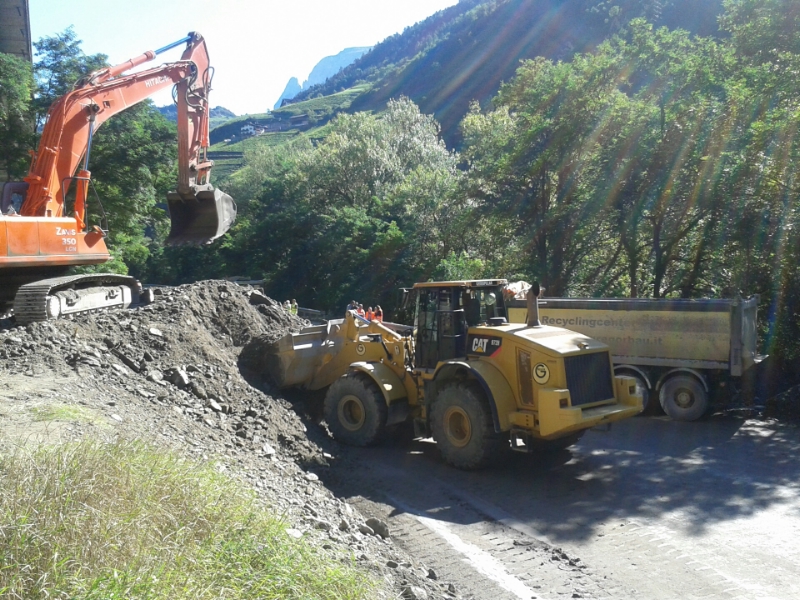 50.000 Euro werden allein die Kosten für die Instandsetzung der durch die Mure des Gastererbaches verlegten Staatsstraße bei Abzwang betragen. Der Straßendienst hat gestern (1. September) mit den Aufräumarbeiten der Erd- und Geröllmassen begonnen; die Aufräumarbeiten können voraussichtlich morgen oder übermorgen abgeschlossen werden. An die die 5000 Kubikmeter Murmaterial müssen weggeräumt werden, das entspricht etwa 400 Lkw-Ladungen. Die Landesabteilung Straßendienst rechnet für diesen Abschnitt mit Spesen von ca. 20.000 Euro für Aufräumarbeiten und weitere ca. 30.000 Euro für die Wiederherstellung des betroffenen Straßenabschnittes. Weitere Aufräumarbeiten erfolgen auf den Landesstraßen Sarntal - Wangen, Blumau - Völs vor dem Gasthof Faust und Völs - Tiers oberhalb des Gasthofs Faust.