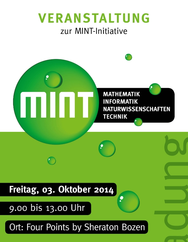 Mathematik, Informatik, Naturwissenschaft und Technik - das sind die MINT-Fächer. Um auf die Bedeutung dieser Schul- und Studienfächer für die gesellschaftliche und wirtschaftliche Entwicklung hinzuweisen und das Interesse der Jugendlichen daran zu wecken, veranstaltet die Landesabteilung Bildungsförderung, Universität und Forschung im kommenden Oktober erneut einen MINT-Tag. Gemeinsam mit den Partnern der Initiative - dem deutschen, italienischen und ladinischen Bildungsressort, der Freien Universität Bozen, der EURAC, dem Naturmuseum, dem Wirtschaftsforschungsinstitut der Handelskammer Bozen - lädt sie Schülerinnen und Schüler der Oberstufe, Lehrpersonen, Schulführungskräfte, Eltern und Interessierte am Vormittag des 3. Oktobers ins Hotel Sheraton in Bozen.