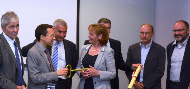 Symbolischer Schlüssel bei der Übergabe des Rehazentrums in der Bozner Fagenstraße: Gesundheitslandesrätin Martha Stocker (Mitte) und Bautenlandesrat Christian Tommasini (li.).