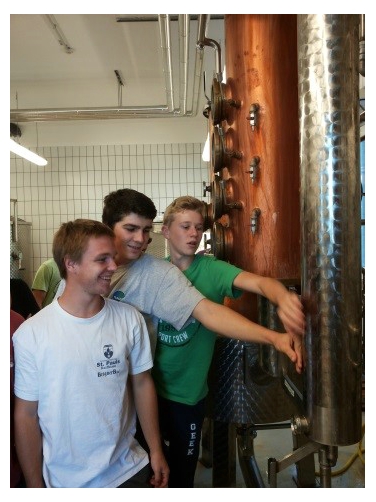 Die Schüler Michael Puff, Alexander Elsler und Alex Ladurner von der Fachschule Laimburg beim Besuch in der Obstbrennerei