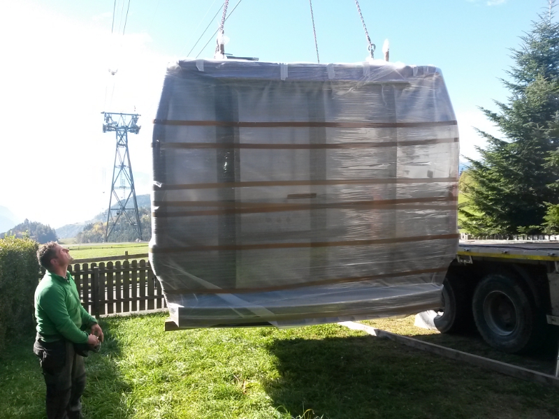 Kostbare Fracht: Säuberlich verpackt wurden die beiden neuen Kabinen der Rittner Seilbahn angeliefert