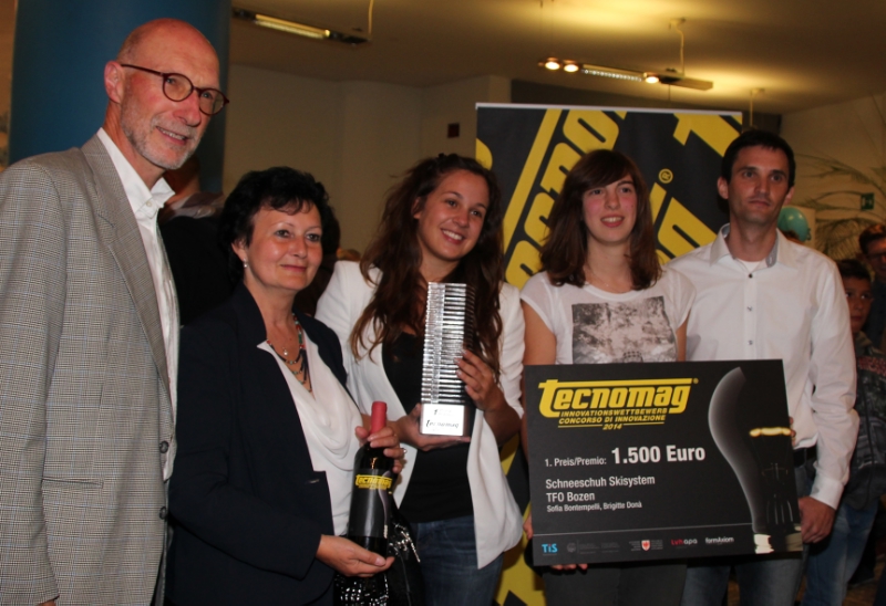 Die Bozner TFO hat die diesjährige Ausgabe des Tecnomag-Innovationspreises quasi monopolisiert: Gleich drei preisgekrönte Projekte stammen von Maturanten der Maschinenbauklassen der "Max Valier", darunter auch das Siegerprojekt, ein Schneeschuh-Ski-System der Schülerinnen Sofia Bontempelli und Brigitte Doná, die betreut von ihrem Lehrer Georg Caminada einen Schneeschuh entwickelt haben, der sich rasch und einfach in einen 1,20 Meter langen Ski verwandeln lässt - damit aus dem Abstieg eine Abfahrt werden kann.