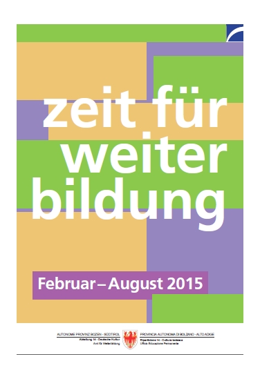 Die Broschüre „Zeit für Weiterbildung" bietet einen Überblick über Kurse, Seminare, Workshops und Veranstaltungen für Beruf, Gesundheit, Freizeit, Kreativität, Soziales und viele andere Bereiche. Kostenlos erhältlich ist die Kursbroschüre in den verschiedenen Landesämtern, Bibliotheken, Raiffeisenkassen und Bildungseinrichtungen. Online kann die Broschüre unter www.provinz.bz.it/weiterbildung unter „Publikationen" bestellt werden. Es besteht auch die Möglichkeit die Broschüre telefonisch zu abonnieren. Die wird dann auf dem Postwege kostenlos zugeschickt.