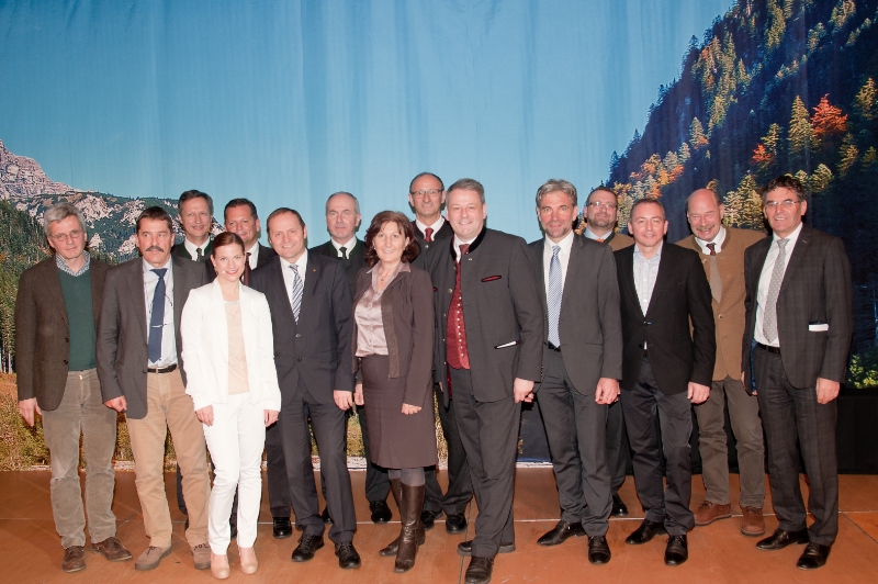 Preisverleihung in Galtür: LR Schuler (5. von rechts) u.a. mit dem österreichischen Landwirtschaftsminister Rupprechter (6. von rechts) und dem Tiroler Landwirtschaftslandesrat Geisler (6. von links).