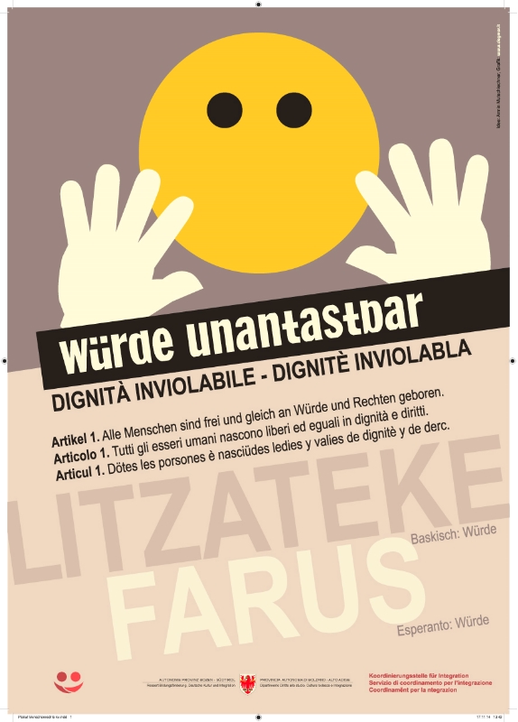 Ein Monat lang - vom 16. Februar bis 16. März - werden in zahlreichen Südtiroler Gemeinden Plakate mit Auszügen aus der Allgemeinen Erklärung der Menschenrechte zu sehen sein. Die Koordinierungsstelle für Integration des Landes (KOI), angesiedelt im Ressort von Landesrat Philipp Achammer, will mit dieser Plakataktion die Südtiroler Bevölkerung auf das Thema "Menschenrechte und Integration" aufmerksam machen. Das Leben unserer neuen Mitbürgerinnen und Mitbürgern ist sehr oft von Schicksalsschlägen, von Krieg und von Verfolgung und von Missachtung der menschlichen Würde gekennzeichnet.