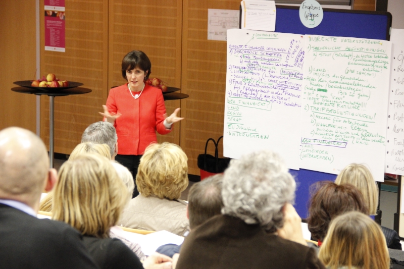 Eine ganze Reihe von Anregungen kam zur besseren Vereinbarkeit von Familie und Beruf: von der Zeitpolitik über die "wichtige" Rolle der Väter bis hin zur Kleinkind-, Sommer- und Nachmittagsbetreuung. Befürwortet wurde eine Gleichstellung der Eltern in öffentlichen und privaten Betrieben, eine rentenmäßige Absicherung von Erziehungszeiten und eine einjährige Arbeitplatzgarantie in der Privatwirtschaft. Hingewiesen wurde auch auf die Tatsache, dass Großeltern angesichts des angehobenen Renteneintrittsalters und der zunehmenden weiblichen Berufstätigkeit künftig als Betreuungspersonen nicht mehr wie bisher zur Verfügung stünden.