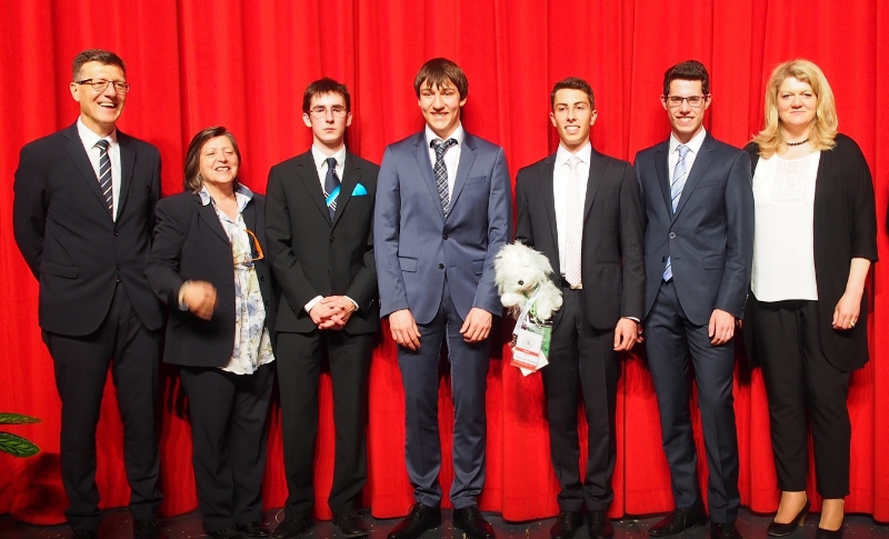 Die vier Erstplatzierten des Wettbewerbs (Bildmitte) mit Schulamtsleiter Peter Höllrigl (1.v.l.), Inspektorin Marta Herbst (2. v.l.) und Landeskoordinatorin Roswitha Maurer