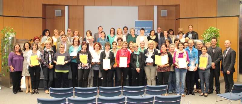 Gruppenfoto von der Verleihung der Zertifikate an 24 Bibliotheken. Foto: LPA / Martin Silbernagl