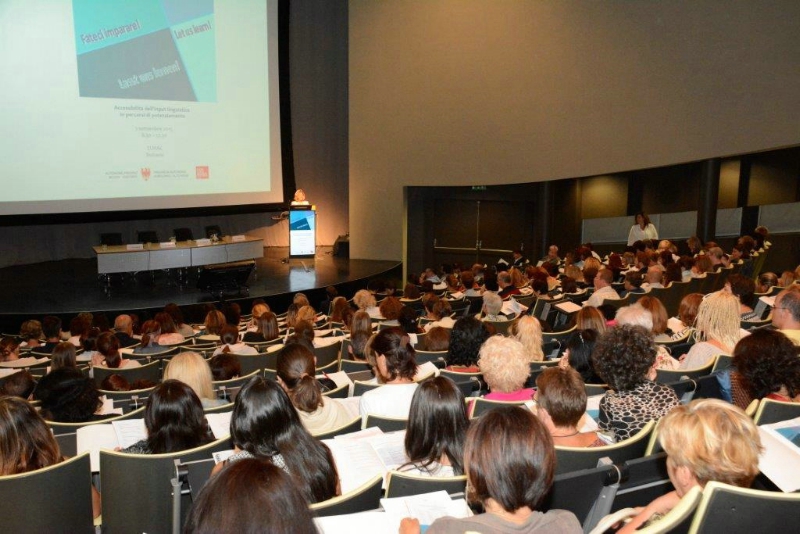 Nach einer Begrüßung durch Rosella Li Castri, Koordinatorin des Pädagogischen Bereichs im italienischen Bildungsressort des Landes, und Carlotte Ranigler, Inspektorin für Deutsch als zweite Sprache, gingen die Referenten in ihren wissenschaftlichen Vorträgen näher auf den Spracherwerb ein. Carlos Melero sprach zum Thema „Dyslexie und Sprachenerwerb", Luciana Favaro über "Flipped Classroom" und Sprachenerwerb, Stefania Cavagnoli berichtete über die mehrsprachigen Angebote in den Südtiroler Schulen mit italienischer Unterrichtssprache und Graziano Serragiotto hielt einen Vortrag über die Bewertung des Sprachenerwerbs im Rahmen des Förderunterrichts. Alle vier Referenten sind Professoren oder Forscher an den Universitäten von Venedig oder Rom. Besonderes Interesse bestand am CLIL-Modell (Content and Language Integrated Learning), das an mehreren italienischen Schulen bereits seit Jahren praktiziert wird. Dabei werden Inhalte einzelner Fächer in der zweiten bzw. in einer Fremdsprache unterrichtet.