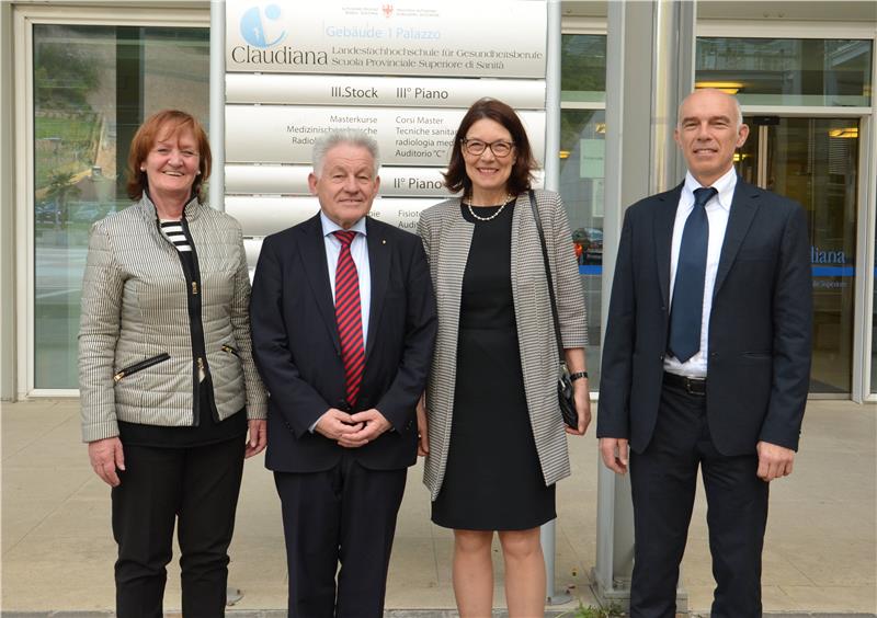 Dabei besuchte LH Pühringer am Donnerstagnachmittag (7. April) zunächst die Landesfachhochschule für Gesundheitsberufe Claudiana in Bozen. In Oberösterreich arbeitet man derzeit an einer Neuausrichtung der Studiengänge für Krankenpflege, deshalb standen die Ausbildungsmöglichkeiten in den verschiedenen Gesundheitsberufen, aber auch bestehende Kooperationen mit Universitäten und Bildungseinrichtungen im In- und Ausland im Mittelpunkt des Gesprächs mit Gesundheitslandesrätin Martha Stocker, dem Vorstandsmitglied Herta Burger sowie dem Direktor Guido Bocchio. An der Claudiana finden derzeit zwölf Studiengänge, ein Masterstudiengang und zwei Spezialisierungskurse statt: Insgesamt nehmen 600 Studierende an den Lehrgängen teil, pro Jahr verlassen 150 Studienabgänger die Landesfachhochschule in Richtung Arbeitswelt. Die Studiengänge betreffen die Bereiche Prävention, Pflege, Sanitätstechnik und Rehabilitation, zugelassen werden die Studenten nach Absolvierung eines Sprachtests und einer Aufnahmeprüfung. Der Bildungsbedarf wird alle drei Jahre an den Krankenhäusern des Landes ermittelt. "Die strategische Zielsetzung der Claudiana zur Abdeckung des Südtiroler Bedarfs an Fachkräften ist ein sehr guter Ansatz für uns, wie wir die Planungen unserer Studiengänge in Oberösterreich anlegen können", unterstrich Landeshauptmann Pühringer. Die Landesfachhochschule sieht einen stark praxisorientierten Unterricht vor: Von 3000 Unterrichtsstunden sind etwa 45 Prozent Praktikum an in- und ausländischen Einrichtungen des Gesundheitswesens vorgesehen. Landesrätin Stocker berichtete bei dieser Gelegenheit über die Bemühungen um eine verstärkte Zusammenarbeit in der Ausbildung mit dem Land Tirol und das diesbezügliche Gespräch mit ihrem Tiroler Amtskollegen Bernhard Tilg in der vergangenen Woche.