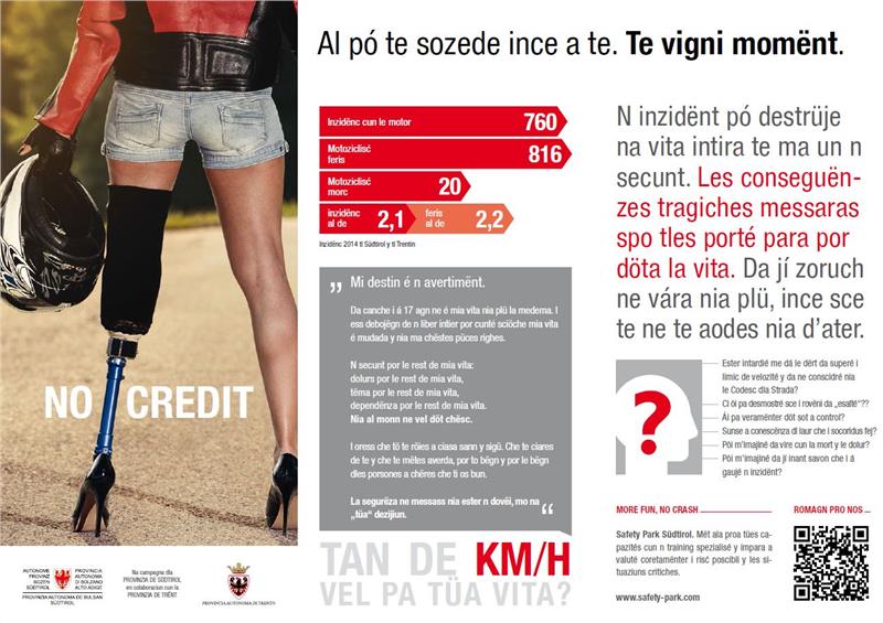 Für mehr Verantwortung im Straßenverkehr setzt sich das Land mit der Kampagne „No credit“ ein. Nun gibt es die Faltblätter dazu auch auf Ladinisch.