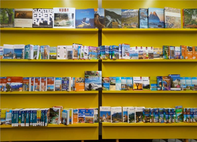 Im Foyer der Landesbibliothek Teßmann sind ein paar hundert neueste Reise-, Kultur-, Architektur- und Wanderführer von bekannten Urlaubszielen ausgestellt, griffbereit zum Ausleihen.
